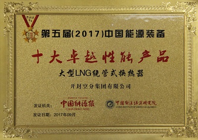 9月20日,由中國能源報社、中國能源經(jīng)濟研究院共同舉辦的首屆(2017)中國能源產(chǎn)業(yè)發(fā)展年會(huì )在北京召開(kāi)。國家能源局總監李冶出席會(huì )議并致辭。會(huì )議對第五屆中國能源裝備十大卓越性能產(chǎn)品進(jìn)行了頒獎,開(kāi)封空分大型LNG繞管式換熱器獲此殊榮。